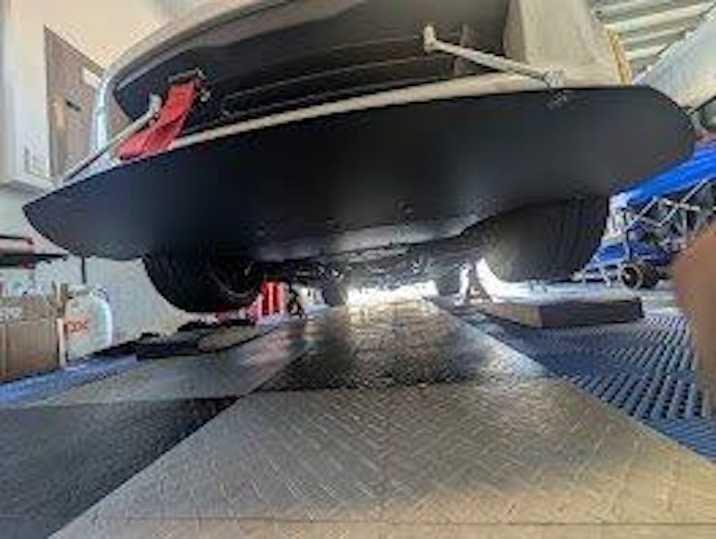 This splitter is nice and flat on the entire bottom side to limit turbulent air as much as possible. Our design also comes in two pieces, allowing for removal of the rear section for quick and easy oil changes.